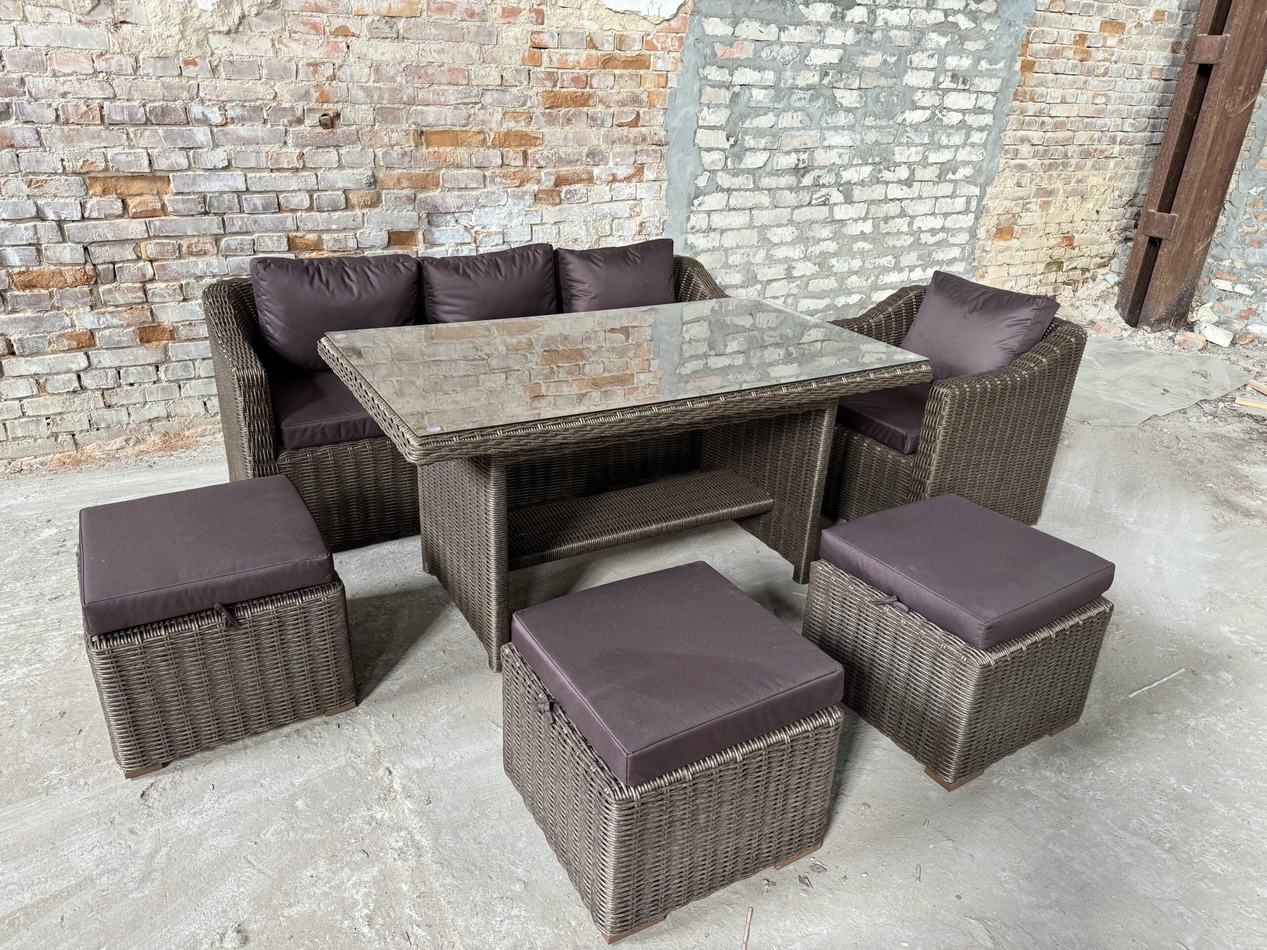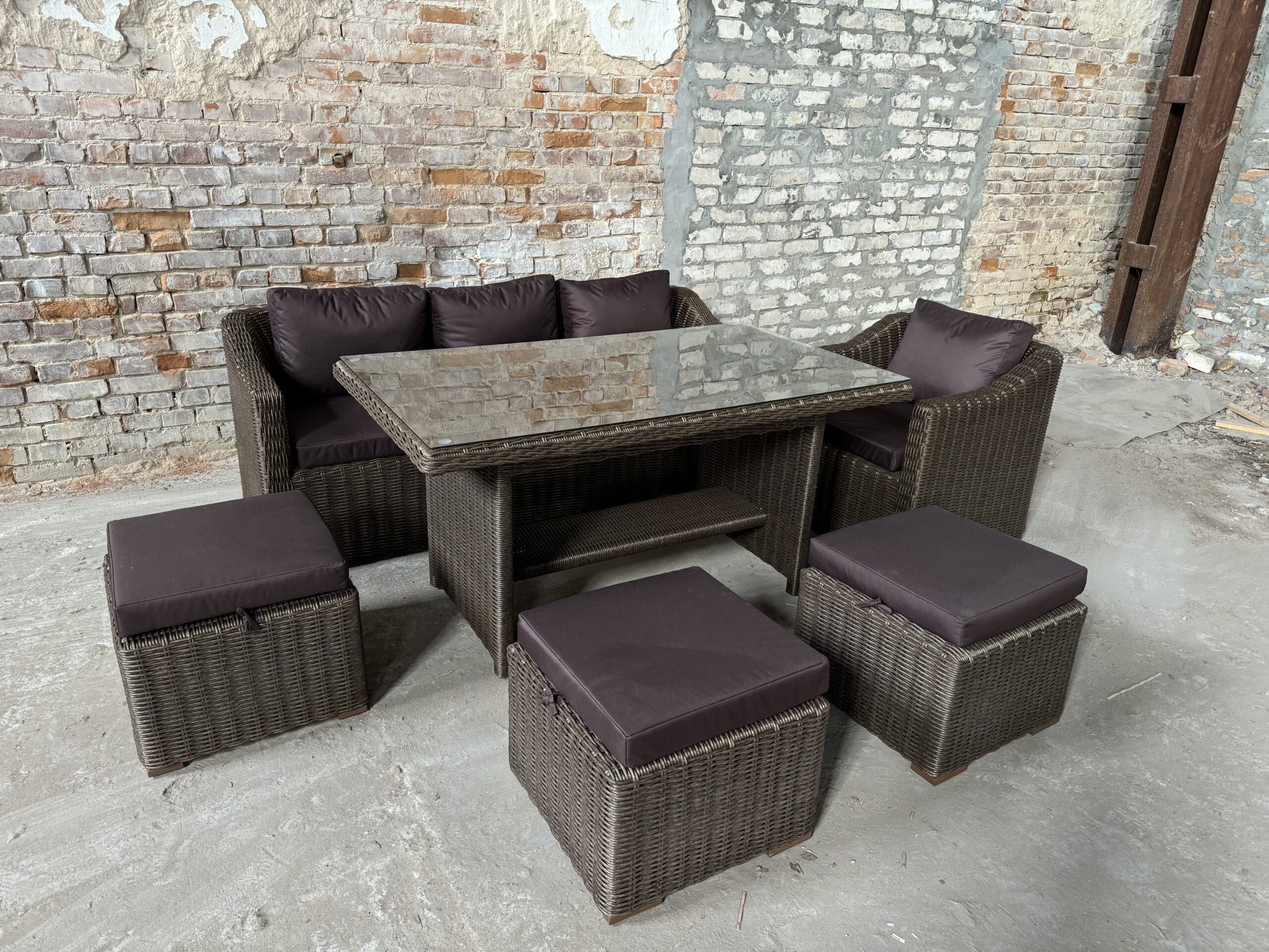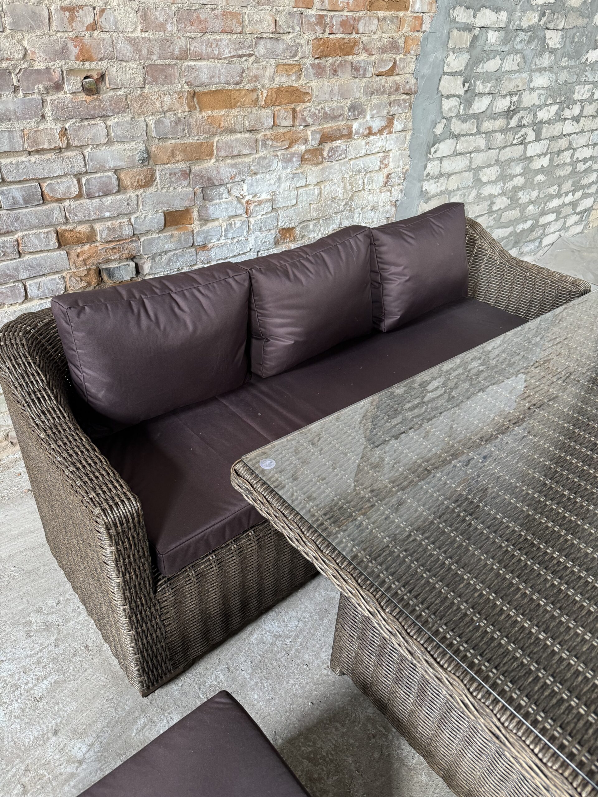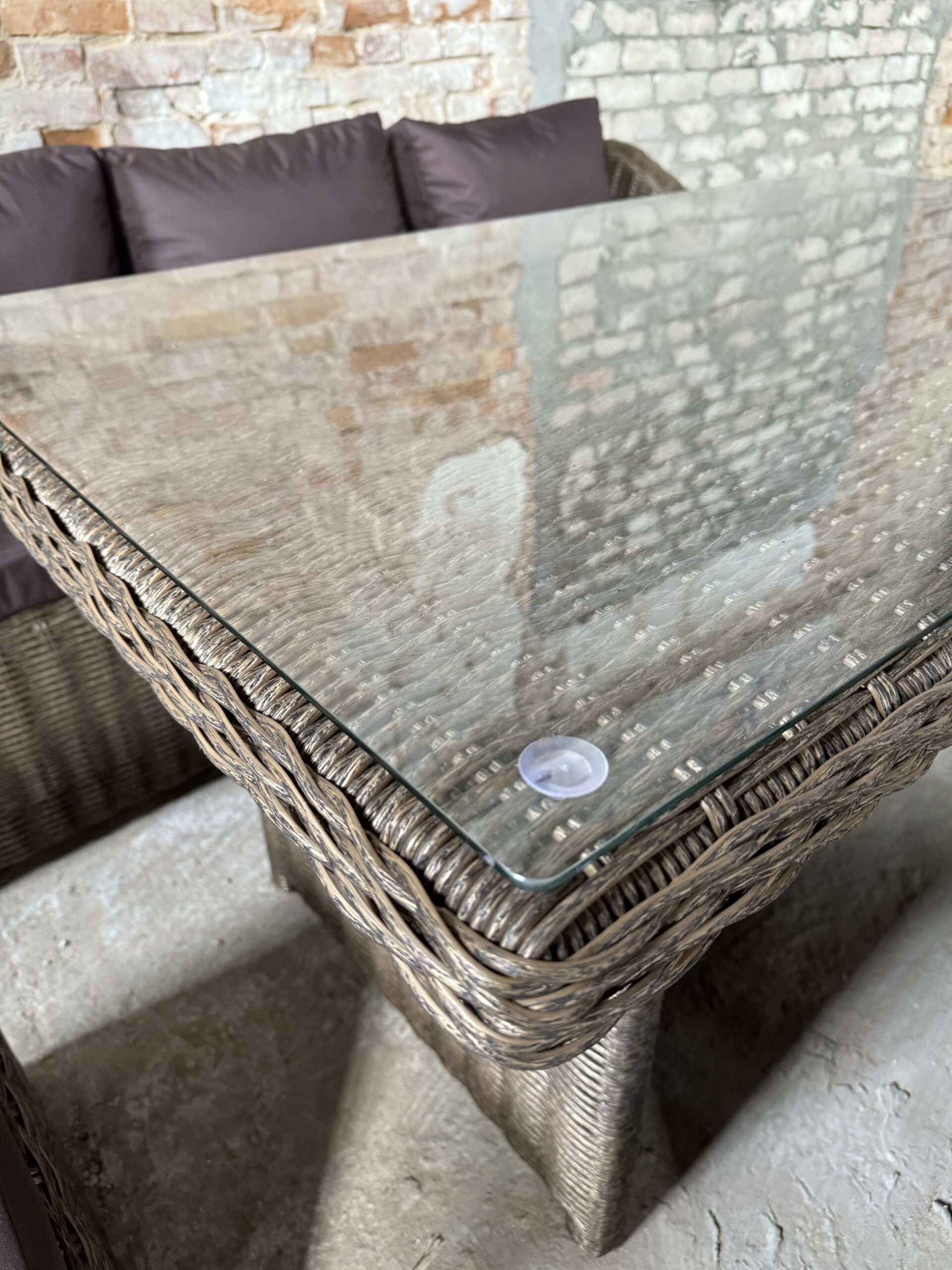 Подушки изготовлены из водоотталкивающей ткани. В качестве столешницы используется закаленное стекло толщиной 6мм.