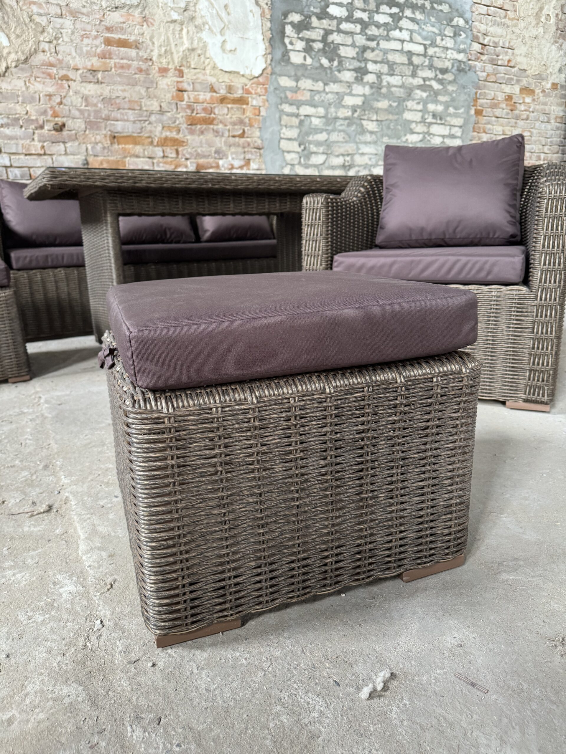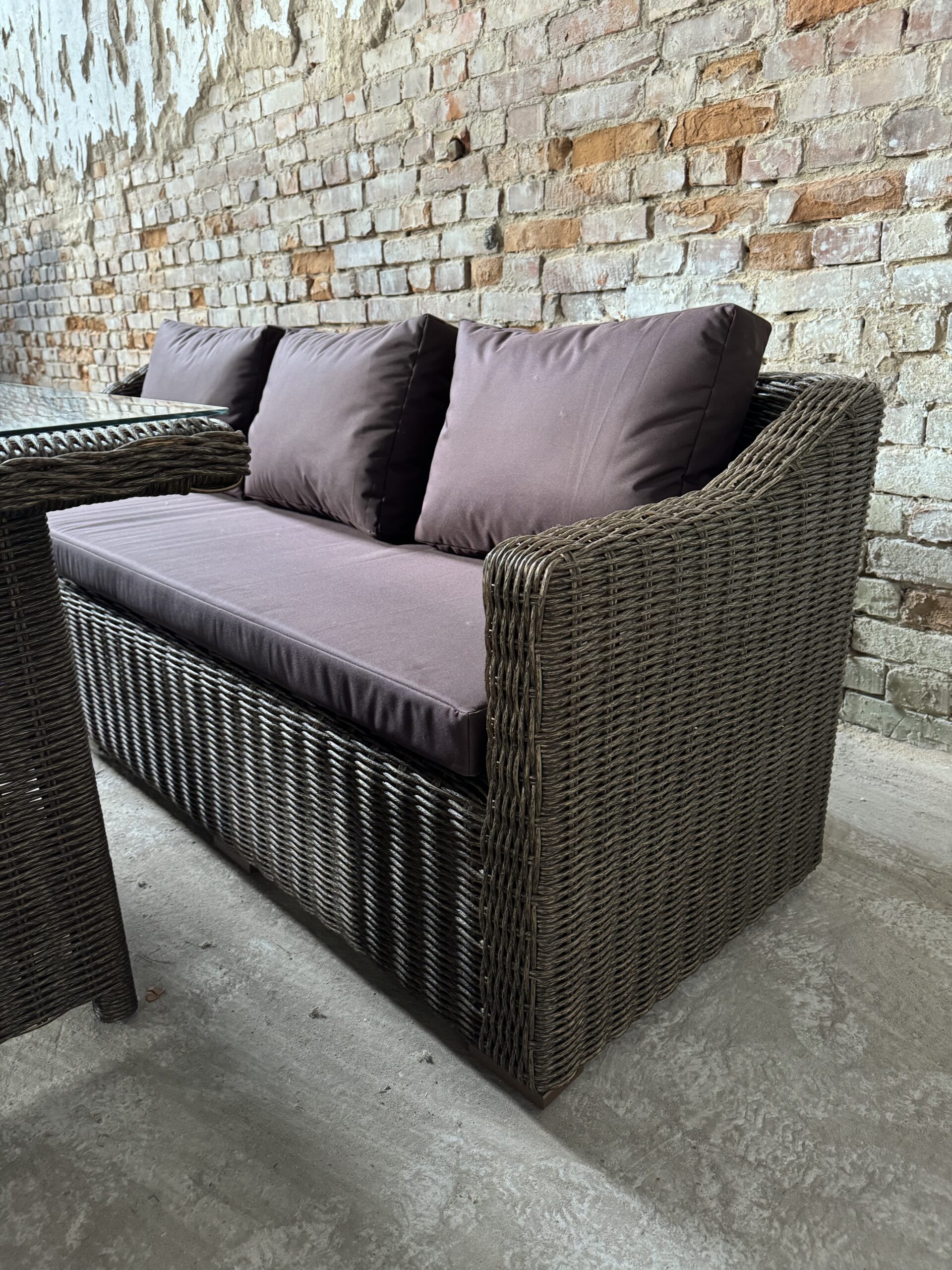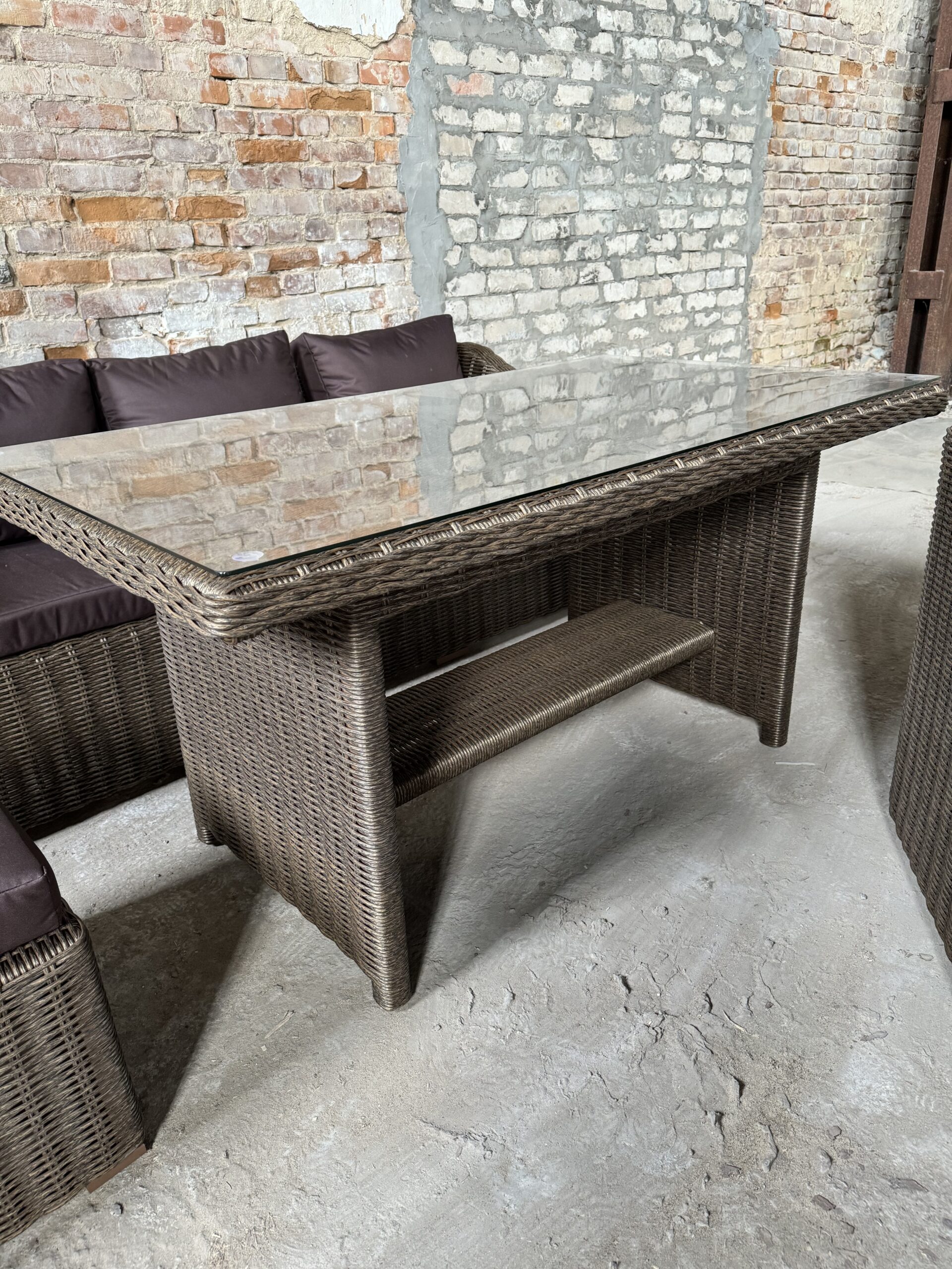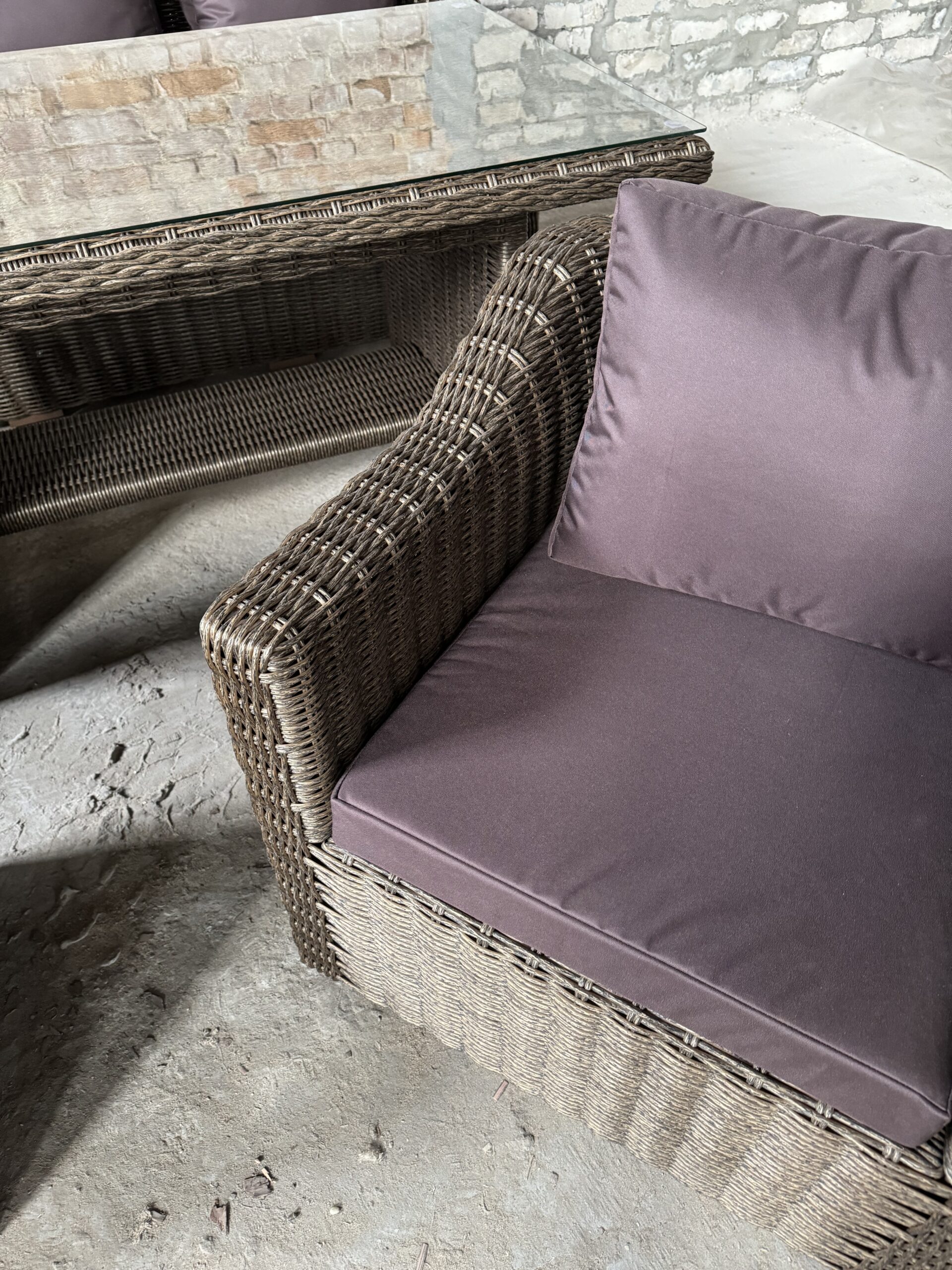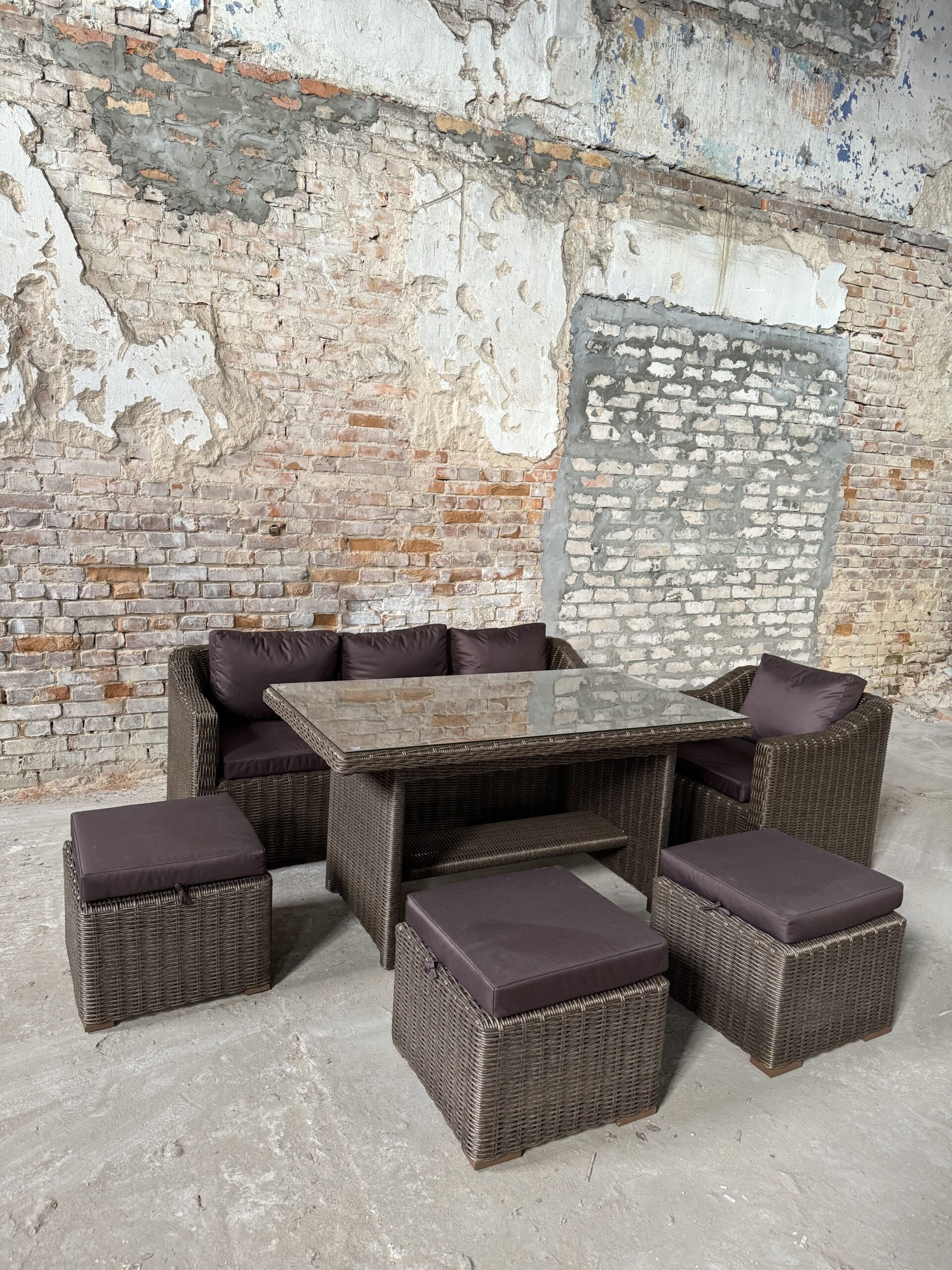Подушки изготовлены из водоотталкивающей ткани. В качестве столешницы используется закаленное стекло толщиной 6мм.